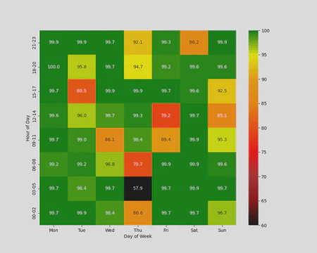 This diagram shows the average availability percentage grouped by day of week and time of day. This allows to spot if there are patterns with reduced availability.