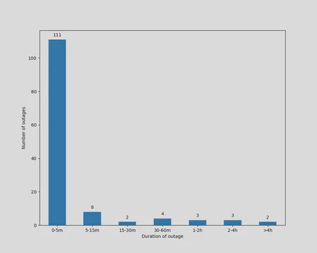 This graph shows how often an outage with a certain duration happened. This is especially relevant to assess the impact of a power outage. As the duration of the outage gets longer, the impact may also get larger. In case a battery backup (UPS) is present, the capacity of the battery bank needs to be sufficient to bridge the outage for successful mitigation of the outage.