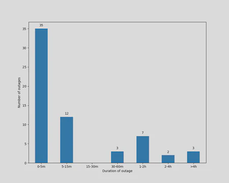 Para recolectar los datos y generar las estadísticas y gráficos, se utilizaron lecturas de un Shelly Pro 3EM 120A, conectado al suministro eléctrico principal. Los datos son recopilados por un Victron Energy Cerbo GX y registrados en intervalos de un minuto en la Nube VRM de Victron Energy. Un script en Python recupera los datos de series temporales sobre el suministro de la red desde VRM, detecta eventos de cortes, genera diversas estadísticas y crea gráficos para visualizar estas estadísticas en múltiples formatos para su presentación en esta página.