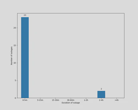 La siguiente tabla muestra un resumen mensual de la disponibilidad en porcentaje de tiempo, así como algunas estadísticas sobre los cortes en ese mes: cuántos cortes se registraron, la duración total de estos cortes, la duración promedio y la duración del corte más largo: